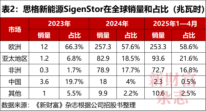 2024年,思格新能源的主打产品SigenStor,在欧洲的销量为257.3兆瓦时,增加20.4倍,占其总销量的比例达57.6%;2025年前4个月销量为253.3兆瓦时,增加9.8倍,占比提升到58.6%。亚太(不含中国内地)和非洲地区的销量占比位列第二和第三,都超过两位数(表2)。