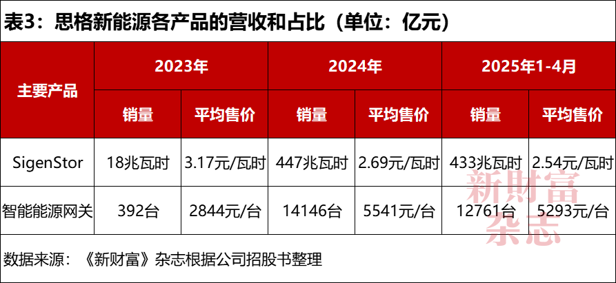 这一策略下,SigenStor的收入增幅明显要低于销量增幅。2024年,其收入增加到12.04亿元,增长20.5倍;2025年前4个月,收入约为11亿元,增长5.5倍,比同期销量增幅少3.5倍、2.2倍(表4)。