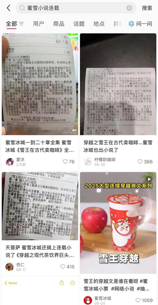 近日,有网友在社交平台发帖称,“蜜雪竟然也开始写小说了!”其在购买蜜雪冰城时发现小票上印有连载小说,篇名为《雪王在古代卖咖啡》,讲述了“雪王”与伙伴小柠檬穿越至古代经营咖啡店的故事。