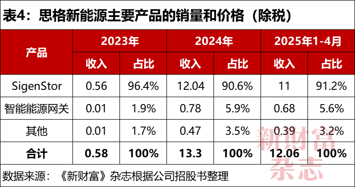 这一策略下,SigenStor的收入增幅明显要低于销量增幅。2024年,其收入增加到12.04亿元,增长20.5倍;2025年前4个月,收入约为11亿元,增长5.5倍,比同期销量增幅少3.5倍、2.2倍(表4)。