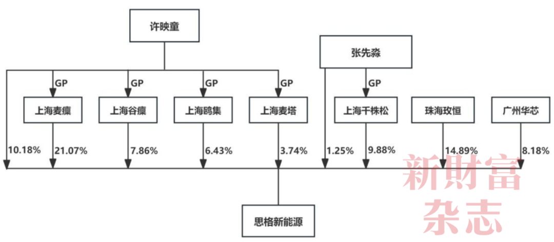 思格新能源IPO前,许映童直接持有10.18%股份,并作为上海鸥集、上海谷廪、上海麦廪及上海麦塔的唯一普通合伙人(GP),共控制思格新能源约49.28%投票权,为实际控制人,实际拥有权益超过37%(附图)。