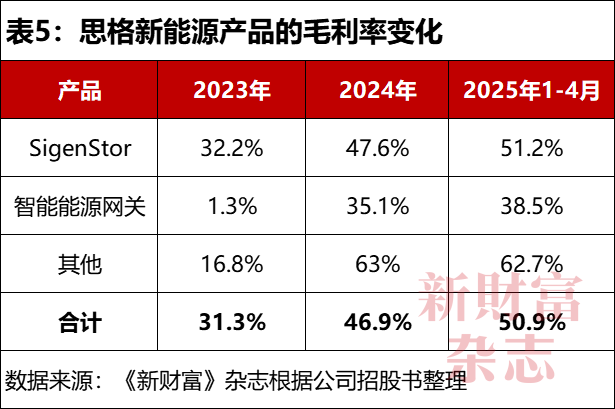 2024年,其主打产品SigenStor的毛利率为47%,2025年前4个月提升到51.2%,毛利润占比为91%,和营收占比基本一致。同期,其智能能源网关业务的毛利率从35.1%增加到38.3%,其他业务的毛利率保持稳定,约为63%(表5)。